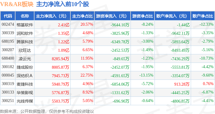 从资金流向上来看,当日VR&AR板块主力资金净流出31.98亿元,游资资金净流入4.39亿元,散户资金净流入27.59亿元。VR&AR板块个股资金流向见下表: