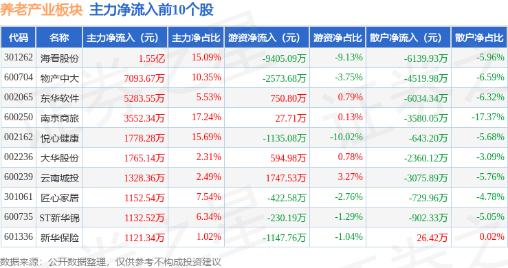 从资金流向上来看,当日养老产业板块主力资金净流出4.5亿元,游资资金净流出6660.46万元,散户资金净流入5.17亿元。养老产业板块个股资金流向见下表: