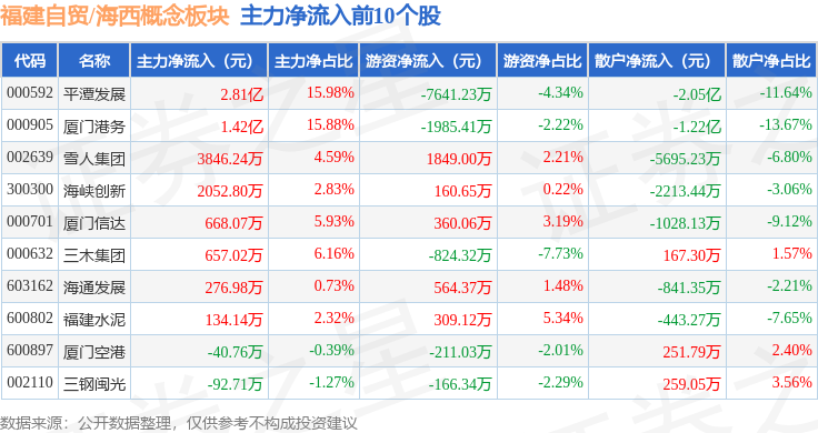 从资金流向上来看,当日福建自贸/海西概念板块主力资金净流入3.46亿元,游资资金净流出8947.32万元,散户资金净流出2.56亿元。福建自贸/海西概念板块个股资金流向见下表: