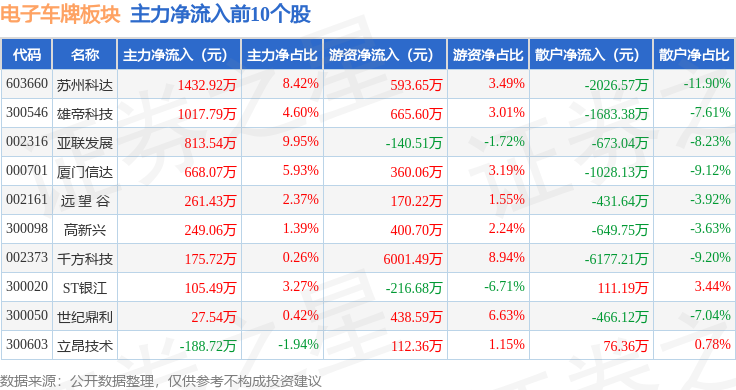 从资金流向上来看,当日电子车牌板块主力资金净流出7461.51万元,游资资金净流入1.07亿元,散户资金净流出3288.34万元。电子车牌板块个股资金流向见下表: