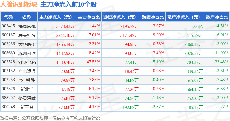 从资金流向上来看,当日人脸识别板块主力资金净流出4.47亿元,游资资金净流入1.39亿元,散户资金净流入3.08亿元。人脸识别板块个股资金流向见下表: