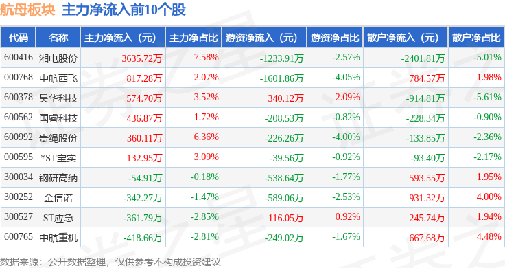 从资金流向上来看,当日航母板块主力资金净流出7.17亿元,游资资金净流入4992.64万元,散户资金净流入6.67亿元。航母板块个股资金流向见下表: