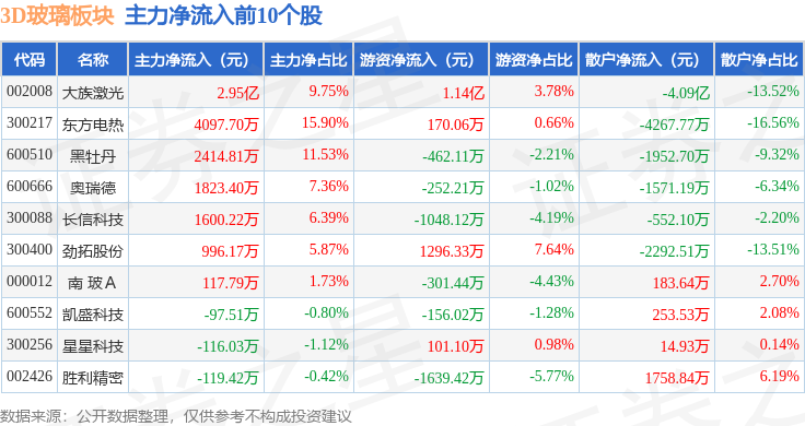 从资金流向上来看,当日3D玻璃板块主力资金净流出4.98亿元,游资资金净流入2.19亿元,散户资金净流入2.79亿元。3D玻璃板块个股资金流向见下表: