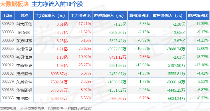 从资金流向上来看,当日大数据板块主力资金净流出36.79亿元,游资资金净流入11.65亿元,散户资金净流入25.14亿元。大数据板块个股资金流向见下表:
