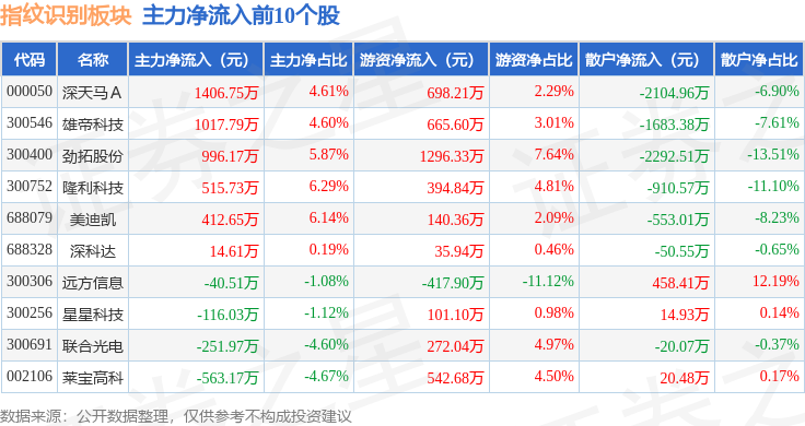 从资金流向上来看,当日指纹识别板块主力资金净流出9.54亿元,游资资金净流入1.88亿元,散户资金净流入7.65亿元。指纹识别板块个股资金流向见下表: