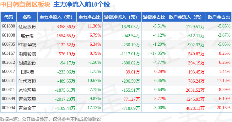 从资金流向上来看,当日中日韩自贸区板块主力资金净流出9341.16万元,游资资金净流出2418.12万元,散户资金净流入1.18亿元。中日韩自贸区板块个股资金流向见下表: