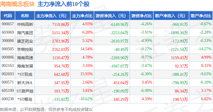 从资金流向上来看,当日海南概念板块主力资金净流出7.02亿元,游资资金净流出1.83亿元,散户资金净流入8.84亿元。海南概念板块个股资金流向见下表: