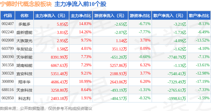 从资金流向上来看,当日宁德时代概念股板块主力资金净流出5.85亿元,游资资金净流入2.71亿元,散户资金净流入3.14亿元。宁德时代概念股板块个股资金流向见下表: