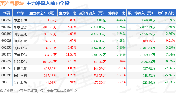 从资金流向上来看,当日页岩气板块主力资金净流出7.51亿元,游资资金净流出8360.52万元,散户资金净流入8.35亿元。页岩气板块个股资金流向见下表: