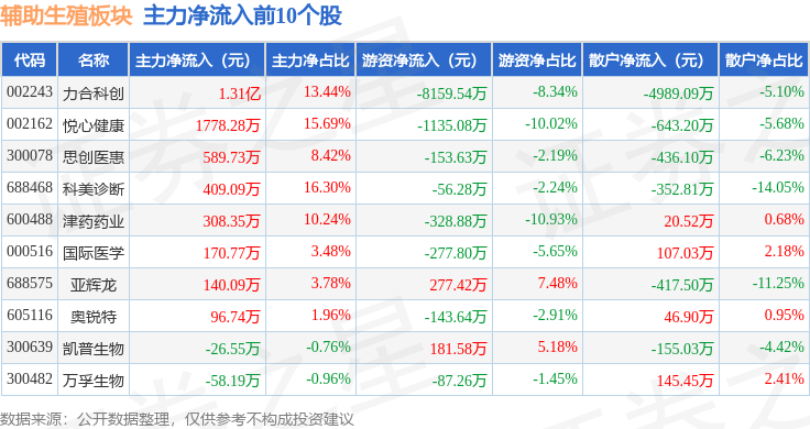 从资金流向上来看,当日辅助生殖板块主力资金净流出2.41亿元,游资资金净流出4816.96万元,散户资金净流入2.89亿元。辅助生殖板块个股资金流向见下表: