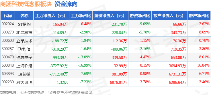 从资金流向上来看,当日商汤科技概念股板块主力资金净流出2.6亿元,游资资金净流入7472.42万元,散户资金净流入1.86亿元。商汤科技概念股板块个股资金流向见下表: