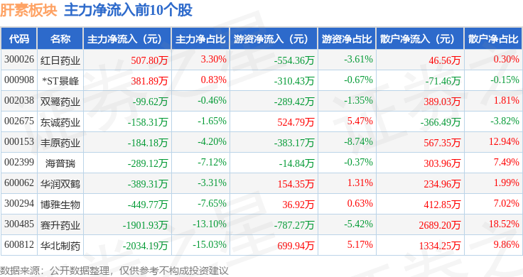 从资金流向上来看,当日肝素板块主力资金净流出2.39亿元,游资资金净流入1784.31万元,散户资金净流入2.21亿元。肝素板块个股资金流向见下表:
