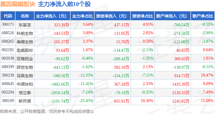 从资金流向上来看,当日基因编辑板块主力资金净流出2.24亿元,游资资金净流入2531.37万元,散户资金净流入1.99亿元。基因编辑板块个股资金流向见下表: