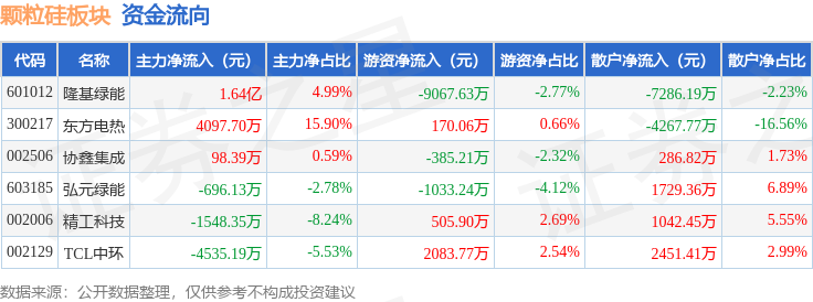 从资金流向上来看,当日颗粒硅板块主力资金净流入1.38亿元,游资资金净流出7726.34万元,散户资金净流出6043.91万元。颗粒硅板块个股资金流向见下表: