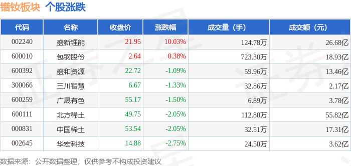 证券之星消息,10月23日镨钕板块较上一交易日下跌0.95%,华宏科技领跌。当日上证指数报收于3922.41,上涨0.22%。深证成指报收于13025.45,上涨0.22%。镨钕板块个股涨跌见下表: