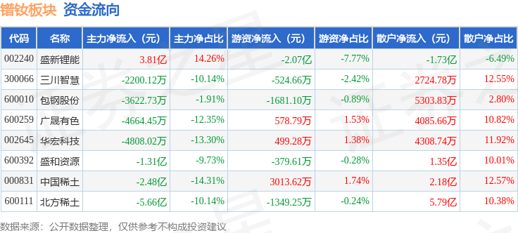 从资金流向上来看,当日镨钕板块主力资金净流出7.17亿元,游资资金净流出2.06亿元,散户资金净流入9.23亿元。镨钕板块个股资金流向见下表: