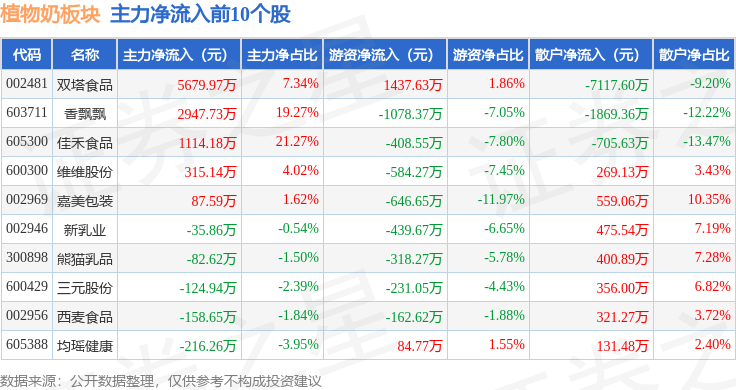 从资金流向上来看,当日植物奶板块主力资金净流出4505.47万元,游资资金净流出2204.91万元,散户资金净流入6710.38万元。植物奶板块个股资金流向见下表: