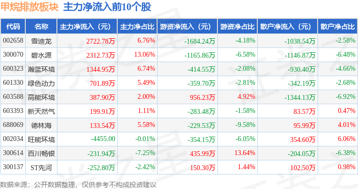 从资金流向上来看,当日甲烷排放板块主力资金净流出3678.91万元,游资资金净流入1905.52万元,散户资金净流入1773.39万元。甲烷排放板块个股资金流向见下表: