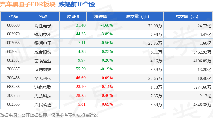 证券之星消息,10月23日汽车黑匣子EDR板块较上一交易日下跌0.57%,均胜电子领跌。当日上证指数报收于3922.41,上涨0.22%。深证成指报收于13025.45,上涨0.22%。汽车黑匣子EDR板块个股涨跌见下表: