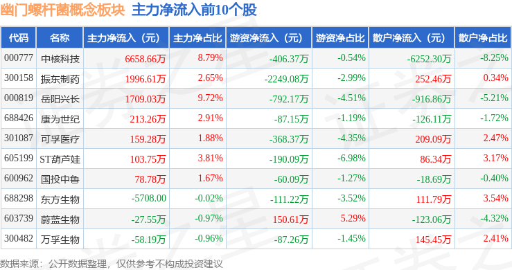 从资金流向上来看,当日幽门螺杆菌概念板块主力资金净流出5.61亿元,游资资金净流出8466.46万元,散户资金净流入6.46亿元。幽门螺杆菌概念板块个股资金流向见下表: