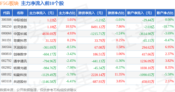 从资金流向上来看,当日F5G板块主力资金净流出2.82亿元,游资资金净流出3545.32万元,散户资金净流入3.17亿元。F5G板块个股资金流向见下表: