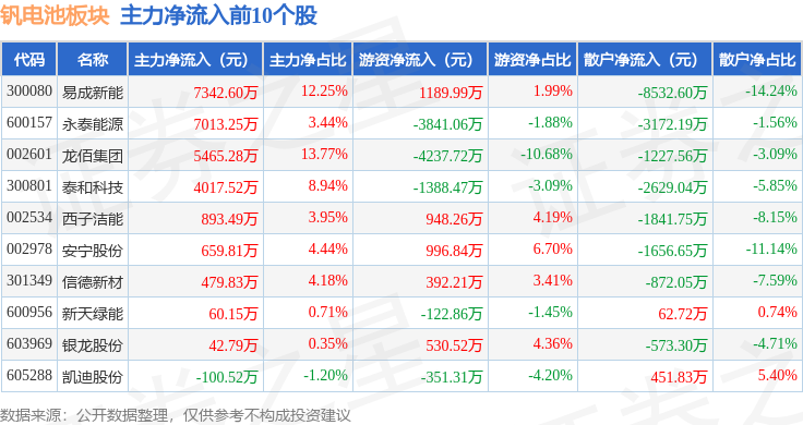 从资金流向上来看,当日钒电池板块主力资金净流出4.54亿元,游资资金净流出906.11万元,散户资金净流入4.63亿元。钒电池板块个股资金流向见下表: