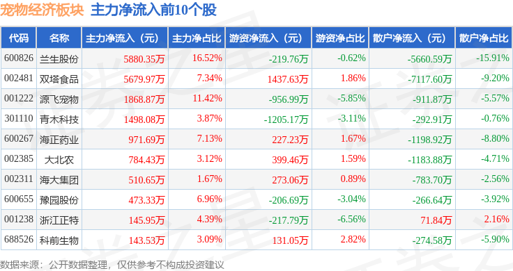 从资金流向上来看,当日宠物经济板块主力资金净流出2.1亿元,游资资金净流出3522.94万元,散户资金净流入2.45亿元。宠物经济板块个股资金流向见下表: