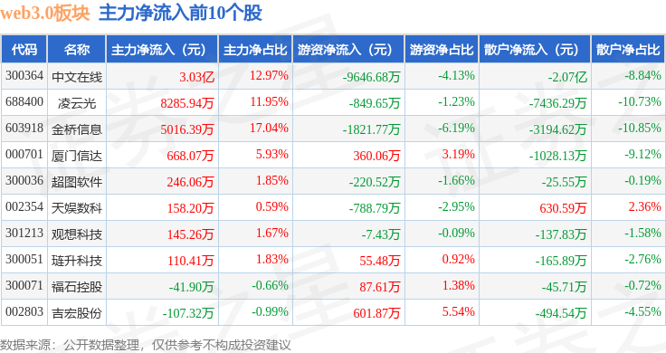 从资金流向上来看,当日web3.0板块主力资金净流出2.12亿元,游资资金净流出2568.45万元,散户资金净流入2.38亿元。web3.0板块个股资金流向见下表: