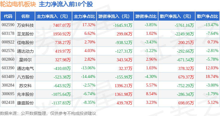 从资金流向上来看,当日轮边电机板块主力资金净流出8.23亿元,游资资金净流入5066.59万元,散户资金净流入7.73亿元。轮边电机板块个股资金流向见下表: