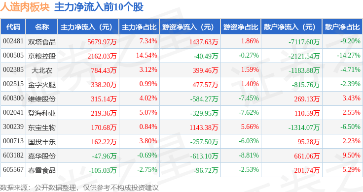 从资金流向上来看,当日人造肉板块主力资金净流出1.4亿元,游资资金净流出5039.76万元,散户资金净流入1.9亿元。人造肉板块个股资金流向见下表: