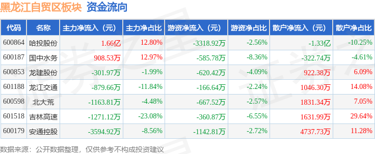 从资金流向上来看,当日黑龙江自贸区板块主力资金净流入1.03亿元,游资资金净流出6862.97万元,散户资金净流出3461.84万元。黑龙江自贸区板块个股资金流向见下表: