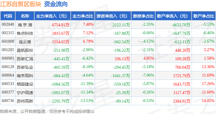 从资金流向上来看,当日江苏自贸区板块主力资金净流入3805.31万元,游资资金净流出5102.15万元,散户资金净流入1296.84万元。江苏自贸区板块个股资金流向见下表: