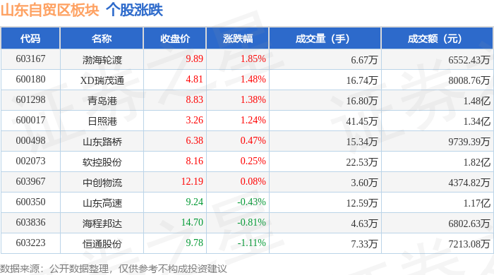 证券之星消息,10月23日山东自贸区板块较上一交易日上涨0.59%,渤海轮渡领涨。当日上证指数报收于3922.41,上涨0.22%。深证成指报收于13025.45,上涨0.22%。山东自贸区板块个股涨跌见下表: