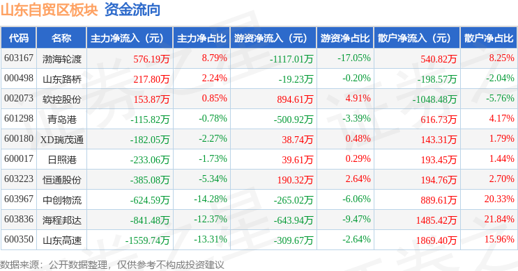 从资金流向上来看,当日山东自贸区板块主力资金净流出2993.96万元,游资资金净流出1692.5万元,散户资金净流入4686.46万元。山东自贸区板块个股资金流向见下表: