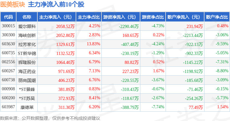 从资金流向上来看,当日医美板块主力资金净流出7.35亿元,游资资金净流出6197.37万元,散户资金净流入7.97亿元。医美板块个股资金流向见下表: