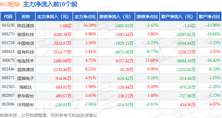 从资金流向上来看,当日6G板块主力资金净流出15.51亿元,游资资金净流入4.72亿元,散户资金净流入10.79亿元。6G板块个股资金流向见下表: