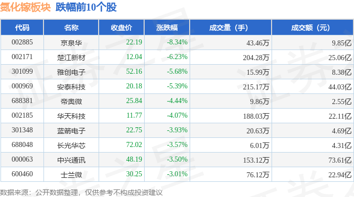 从资金流向上来看,当日氮化镓板块主力资金净流出37.06亿元,游资资金净流入3.98亿元,散户资金净流入33.09亿元。氮化镓板块个股资金流向见下表: