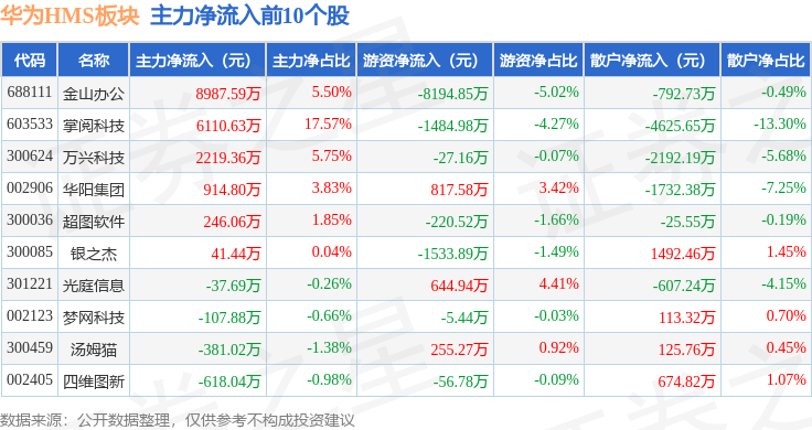 从资金流向上来看,当日华为HMS板块主力资金净流出3.0亿元,游资资金净流出4477.39万元,散户资金净流入3.45亿元。华为HMS板块个股资金流向见下表: