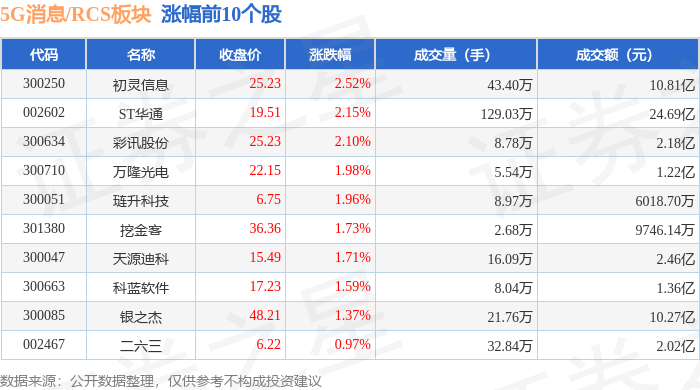 证券之星消息,10月23日5G消息/RCS板块较上一交易日下跌0.71%,线上线下领跌。当日上证指数报收于3922.41,上涨0.22%。深证成指报收于13025.45,上涨0.22%。5G消息/RCS板块个股涨跌见下表: