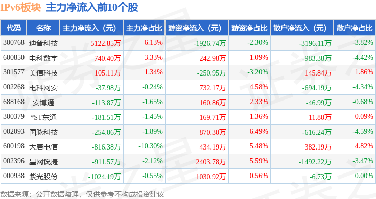 从资金流向上来看,当日IPv6板块主力资金净流出17.23亿元,游资资金净流入6.47亿元,散户资金净流入10.77亿元。IPv6板块个股资金流向见下表:
