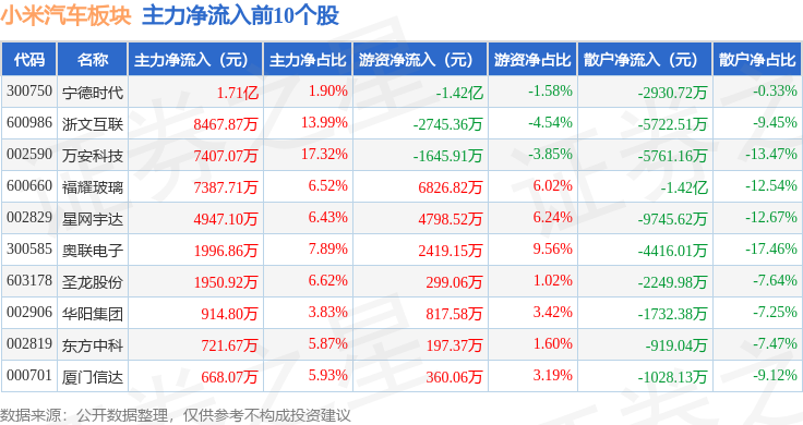 从资金流向上来看,当日小米汽车板块主力资金净流出10.68亿元,游资资金净流入2.78亿元,散户资金净流入7.9亿元。小米汽车板块个股资金流向见下表: