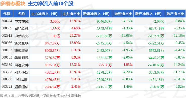 从资金流向上来看,当日多模态板块主力资金净流出4.14亿元,游资资金净流入6856.07万元,散户资金净流入3.45亿元。多模态板块个股资金流向见下表: