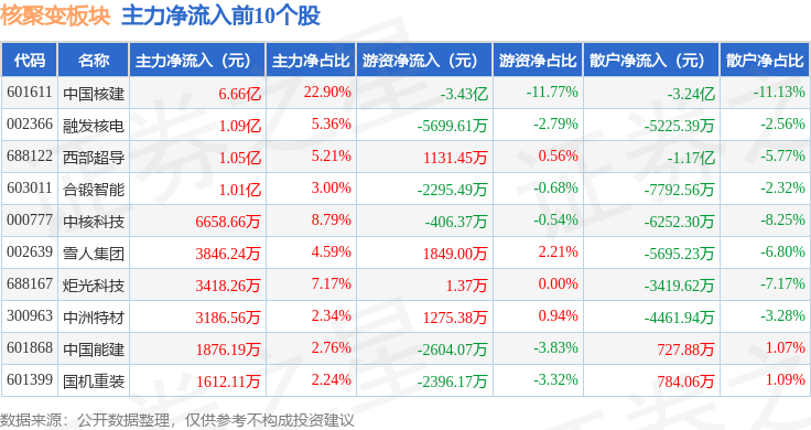 从资金流向上来看,当日核聚变板块主力资金净流入3149.57万元,游资资金净流出2.23亿元,散户资金净流入1.91亿元。核聚变板块个股资金流向见下表: