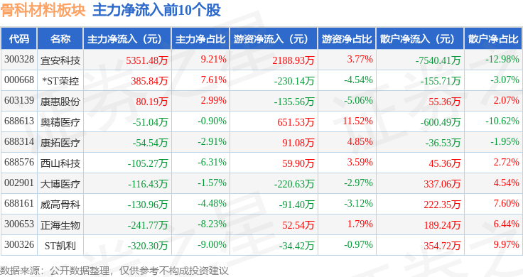 从资金流向上来看,当日骨科材料板块主力资金净流出1.02亿元,游资资金净流入1301.81万元,散户资金净流入8937.06万元。骨科材料板块个股资金流向见下表: