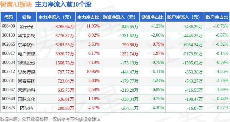 从资金流向上来看,当日智谱AI板块主力资金净流出7.76亿元,游资资金净流入2.82亿元,散户资金净流入4.94亿元。智谱AI板块个股资金流向见下表: