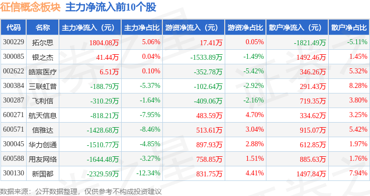 从资金流向上来看,当日征信概念板块主力资金净流出3.96亿元,游资资金净流入6206.57万元,散户资金净流入3.34亿元。征信概念板块个股资金流向见下表: