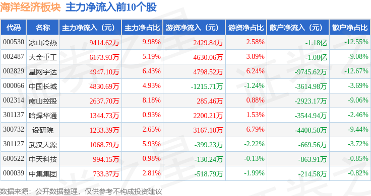 从资金流向上来看,当日海洋经济板块主力资金净流出10.96亿元,游资资金净流入2.66亿元,散户资金净流入8.31亿元。海洋经济板块个股资金流向见下表: