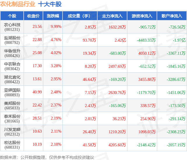 个股表现方面,农化制品行业当日领涨股为农心科技(001231),该股当日报收23.56,上涨9.99%,成交量2.85万,主力资金净流入1632.28万元。盐湖股份(000792)以上涨4.76%紧随其后,该股当日成交量93.7万,主力资金净流入2.42亿元。除此之外,华鲁恒升(600426)、中农联合(003042)、湖北宜化(000422)均进入当日牛股之列。具体个股列表见下表: