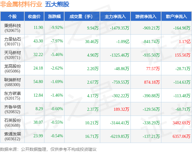 个股表现方面,非金属材料行业当日领跌股为秉扬科技(920675),该股当日报收11.9,下跌9.92%,成交量9.94万,主力资金净流出1479.35万元。力量钻石(301071)以下跌7.97%紧随其后,该股当日成交量30.46万,主力资金净流出1.09亿元。除此之外,天马新材(920971)、龙高股份(605086)、联瑞新材(688300)均进入当日熊股之列。具体个股列表见下表: