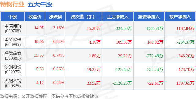 个股表现方面,特钢行业当日领涨股为中信特钢(000708),该股当日报收14.05,上涨3.16%,成交量15.2万,主力资金净流出324.5万元。甬金股份(603995)以上涨0.84%紧随其后,该股当日成交量4.1万,主力资金净流入109.35万元。除此之外,盛德鑫泰(300881)、沙钢股份(002075)、太钢不锈(000825)均进入当日牛股之列。具体个股列表见下表: